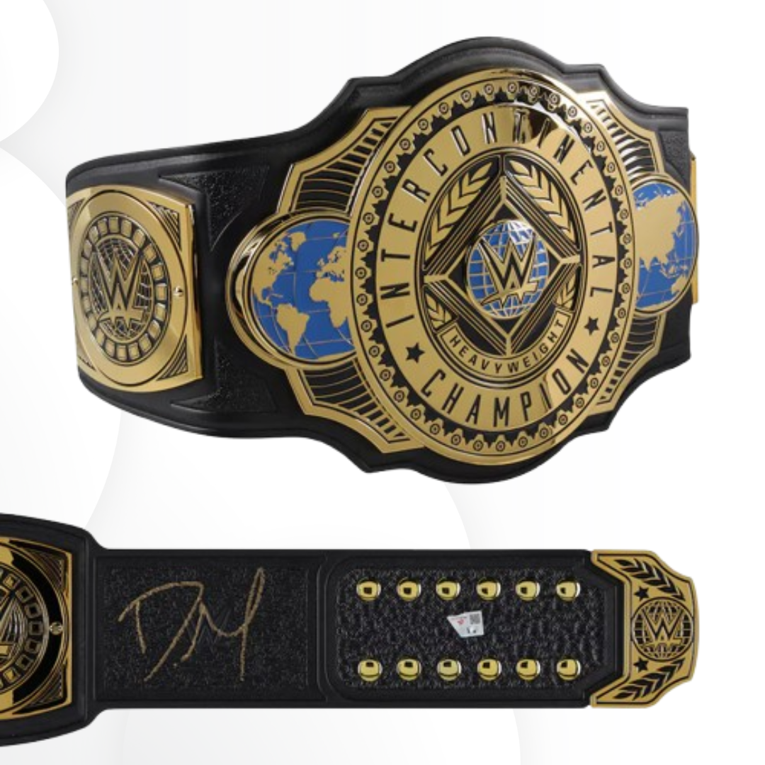 Own a piece of WWE history with this Dominik Mysterio Signed Intercontinental Championship Replica Belt. Expertly crafted to replicate the iconic Intercontinental Championship, this belt features a premium leather strap and intricately detailed metallic plates making it a standout collectible for fans and collectors alike.
