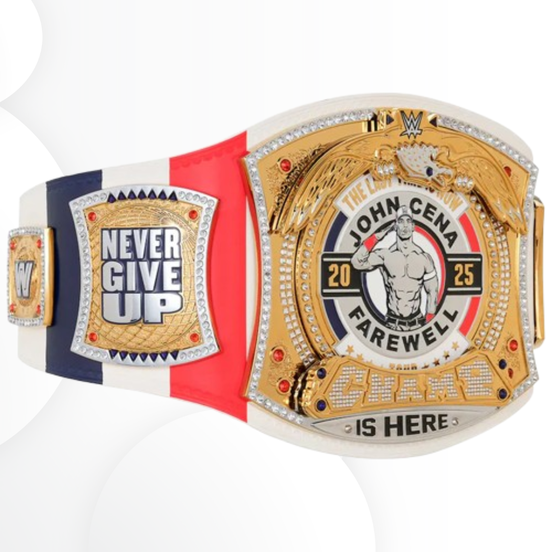Crafted with meticulous detail, this replica recreates the iconic Spinner Championship Title Belt that Cena made famous. Featuring gold plated rotating center plates bold etching and a durable synthetic leather strap it captures the prestige and energy of Cena’s championship reigns while paying tribute to his last tour.